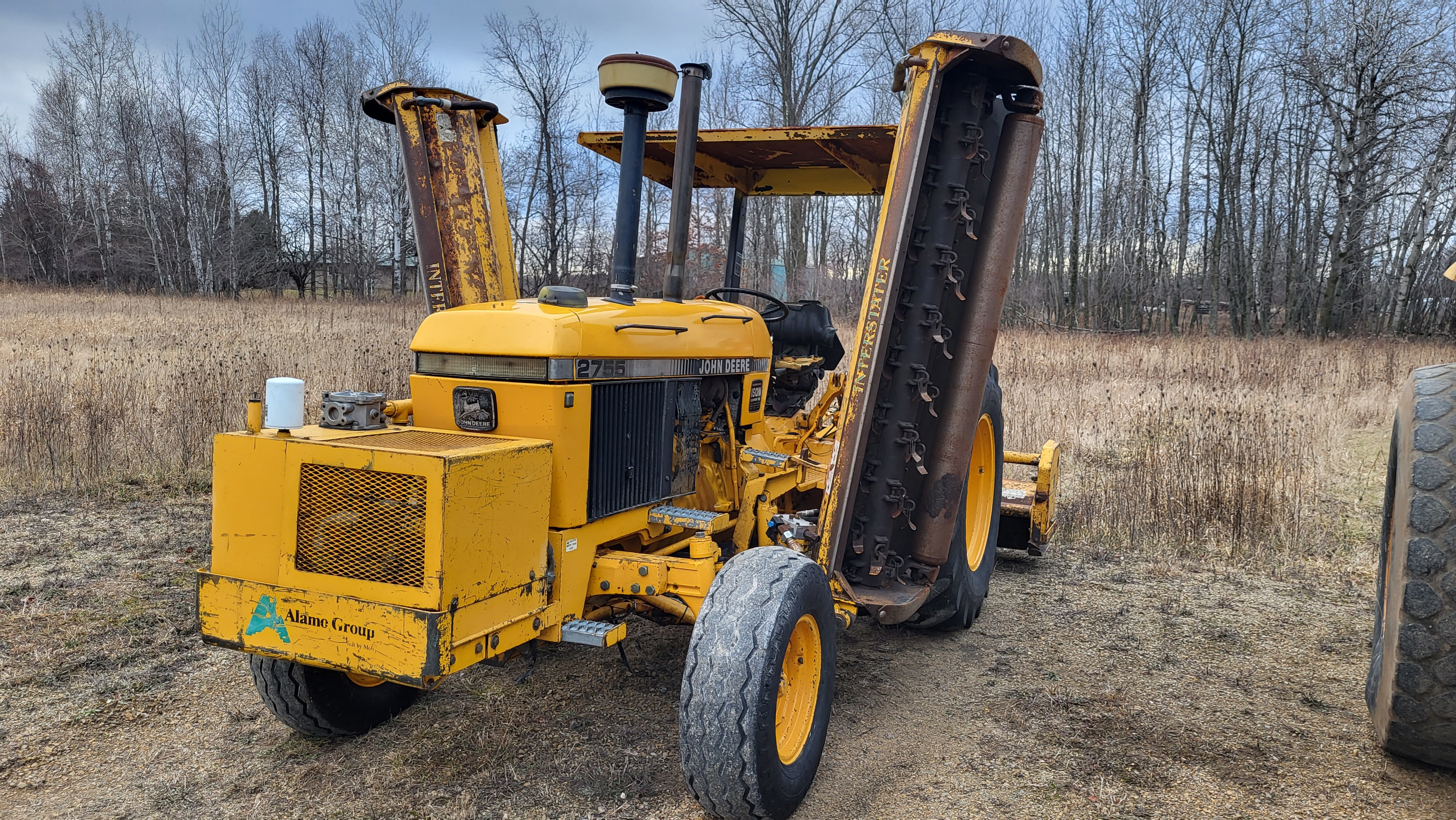Telescoping Jiblift for forklift, 6ft Steel fork extensions, Wright self-dumping hopper for forks, John Deere 2755 Municipal utility tractor w/ Alamo 20ft flail Triple-mowers