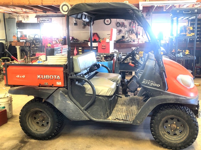 1999 Ford F250 Ext Cab 4x4 Pickp w/ 7.3 PowerStroke Diesel, Kubota RTV500 4x4 Side x Side with 1350 hours, Like New 2023 PJ 20ft tandem axle Skid Steer Trailer w/ 14,000# axles & stand-up ramps