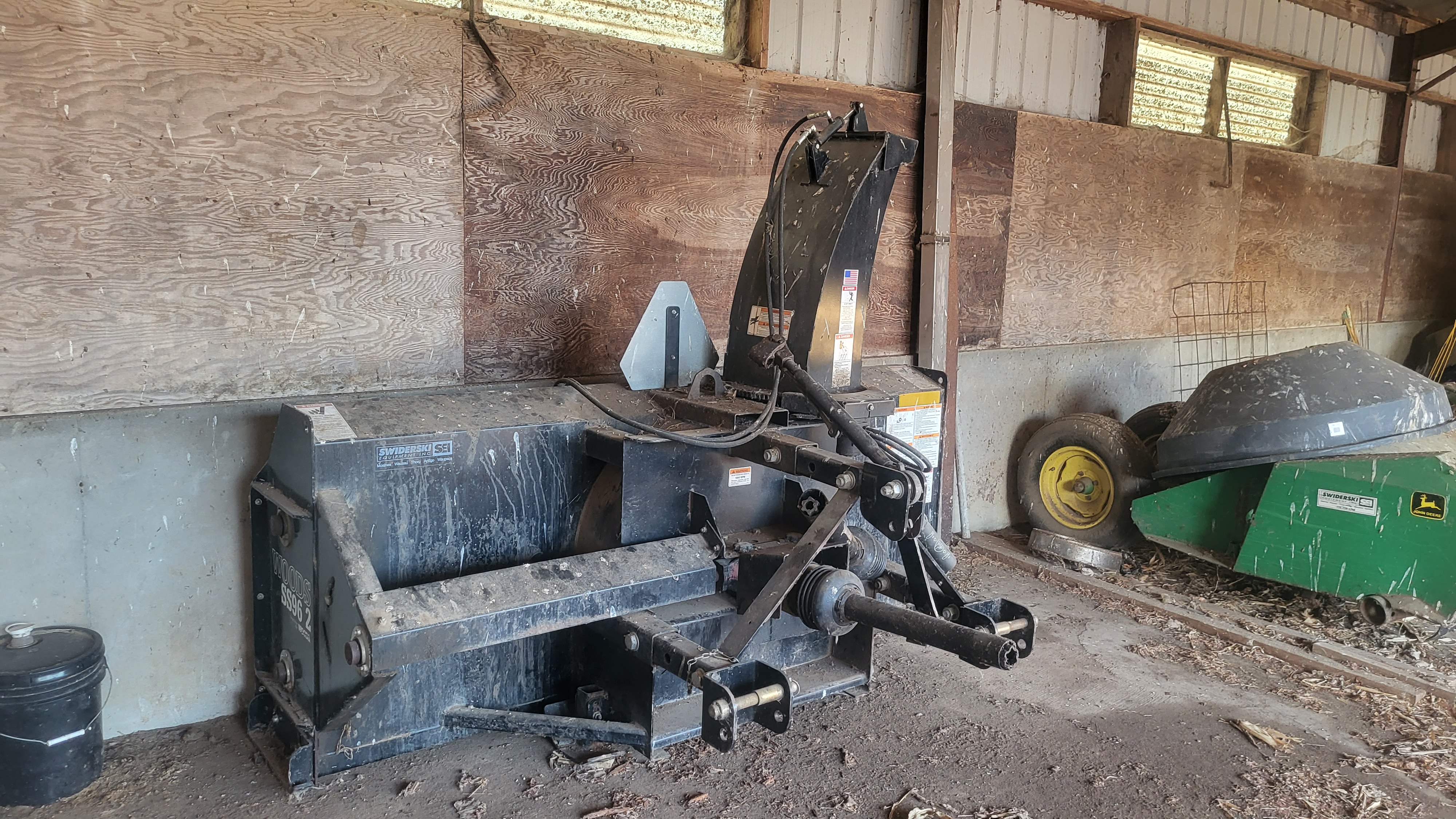 Like New Woods SS96-2 8ft Snowblower, Bin sweep auger, Hyd fertilizer auger, Long fork extensions, 2 sets of John Deere suitcase weights, Wheel weights, 80gal slide-in Fuel Tank, Farm gates & Assorted Parts