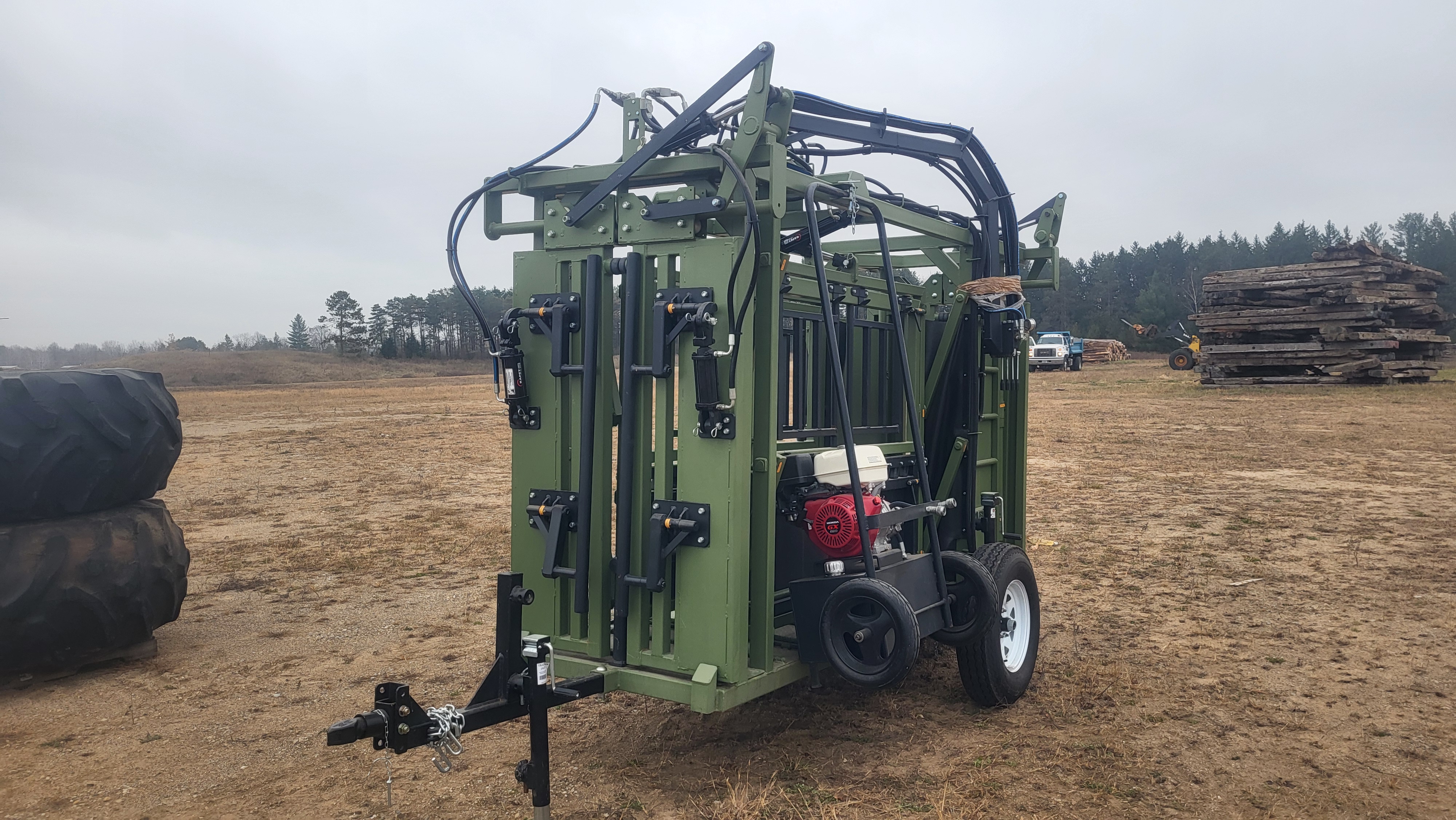 6ft Sickle Mower for skid steer, Excavator thumbs & small bucket, 2,000gal Water Tank, Lg. steel Crane on center post, Budgit 2ton elec Hoist w/ elec Traveler, Lg. Hyd Breaker chisels & punches, Hesco 10KW Mobile Power Unit w/ directional arrows & Ford 4cyl, Hammer hose, Drive-over Scale bed, Like new Big Maxx Modine heater, Dust collector, Floor jack, Tranny jack, 500gal Propane Tank, New 42” pallet forks, 2,000gal Water tank body