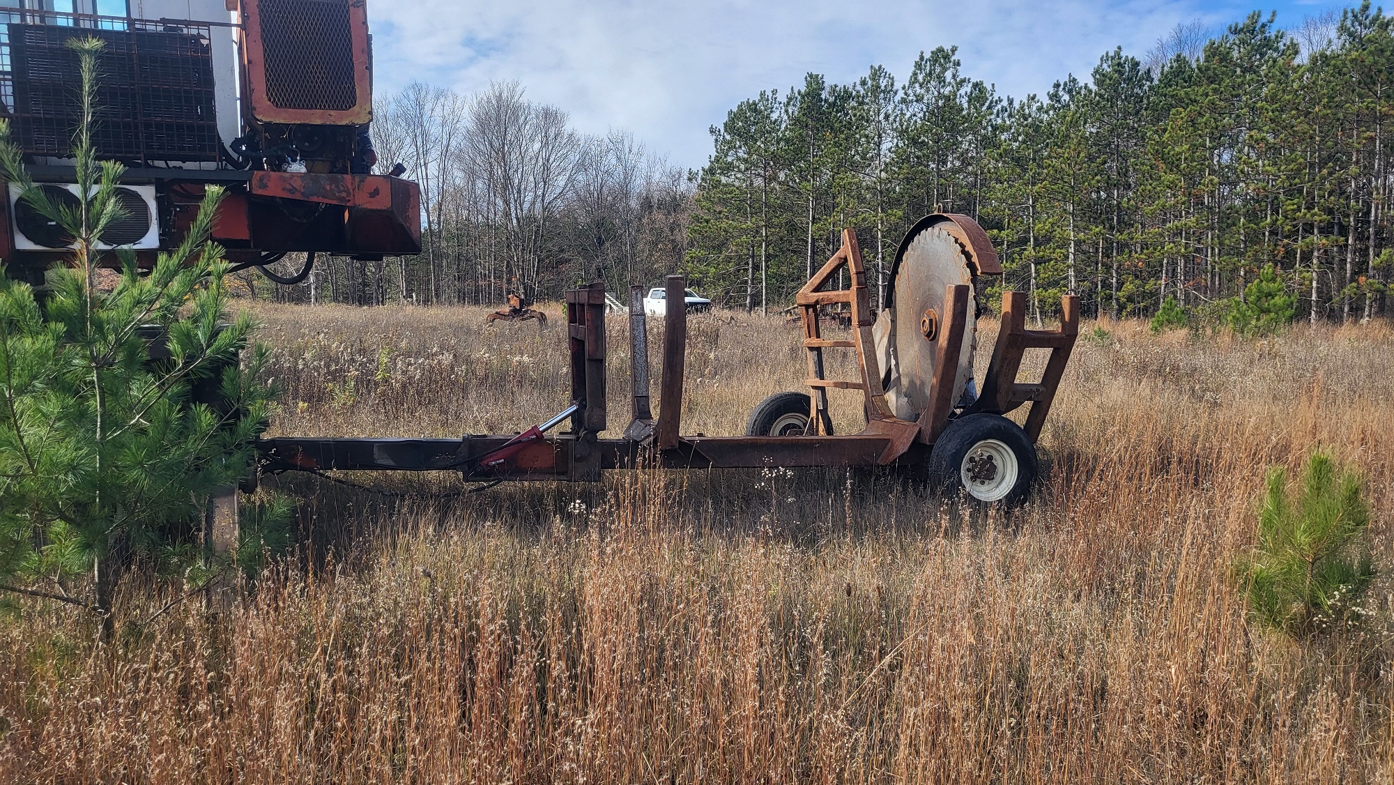 1990 GMC 7000 TopKick w/ V8, 5+2 trans & Hesse 24ft alum Body w/ side roll-up compartments, 2 wheel trailer made from pickup, Loose pallet forks, Hyd Grapple, Mounted 15, 16, 20 & 22.5” truck & trailer tires, Takeoff Mounted Skidder Tires (some with Fluid), Tandem axle Flatbed Trailer, Tri-axle frame, Boat trailer