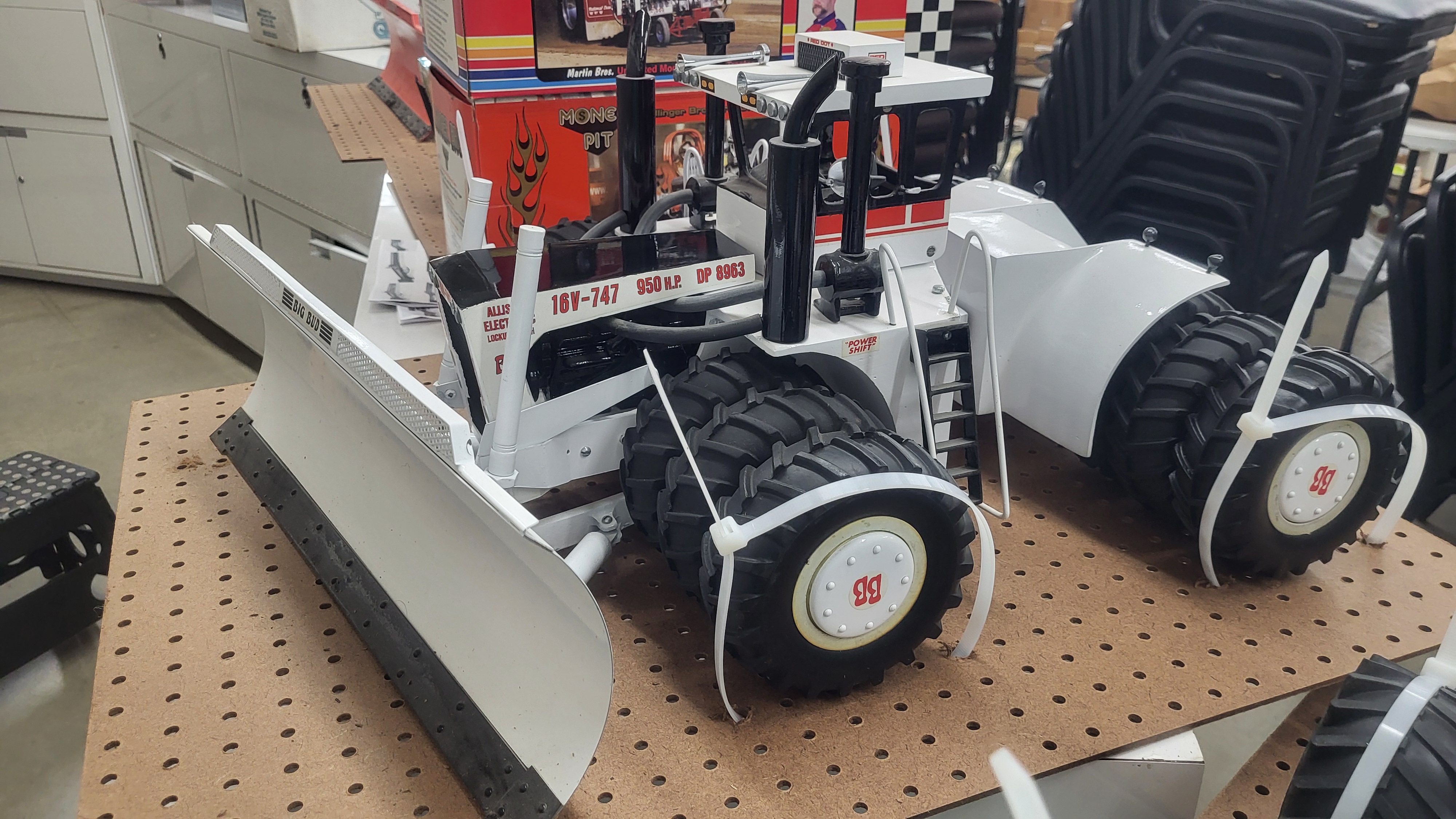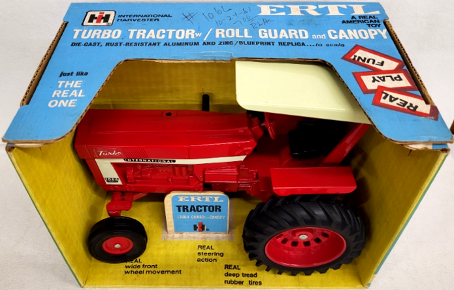 1972 Ertl 1066 Canopy Roll Guard in blue box, Original 1970s IH 1066 & 1466 White Cabs in striped boxes, IH implements in Blue boxes, Farmall toys Restored by Joe Knosby, Custom Farmalls, Toy Farmer IH 1466 with MF Canopy, Case 300 & 350 Customs by Siegel, Case 2390 & 2590 Silver mufflers in boxes, Custom Case tractor & implements by Bob Heath, Precision Engineering JD 8-bottom Plow, JD 4240 Custom w/ Hydra-Push field display by Builders & Collectors Society for St Jude’s, New Orleans 4850, Iowa State Fair 4320, Silver 100 Years 8400R, Yoder JD 730, Near Mint McCormick Farmall 460 diecast rims & Fast Hitch in Closed Box w/ muffler in insert, MINTY Ertl Farmall 400 with Split-rims, Eska Fast Hitch Disk w/ blue steel blades in Closed Box, Custom JD tractors w/ Certificates by Paul Stephan, Scratch-built IH 503 combine by GP, Red Power 403 combine, Gold Chaser Scherrman Implement 656, Precision 1466, Farm Progress Challenger, Collector MAGNUMs in original boxes including Chasers