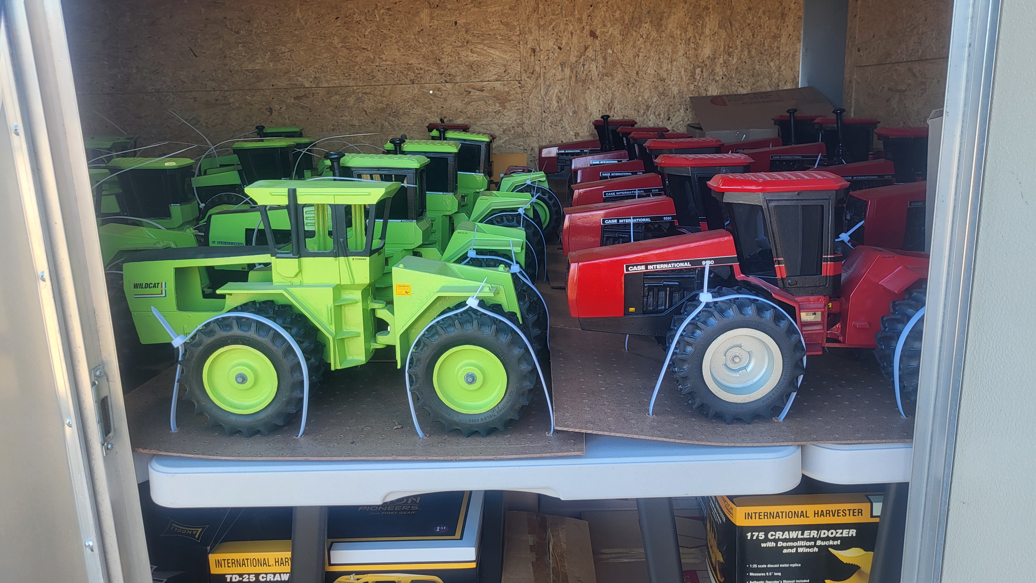 “Midnight Special” JD 7520 Canopy by Precision Engineering (s/n 2) - to Benefit St. Jude Children’s Hospital, Precision Key 7020, Precision 8020, 8850 Prestige Select, Waterloo Works JD 9RX 830, Custom 7520 w/ singles & Dual hubs, 8640 Industrial w/ blade, Custom 8760 Triples by Scott & Amy Templin, Custom New Holland 9880 on Tracks by Joe Knosby—to Benefit St. Jude Hospital, Dealer New Holland T9060 on Singles, Versatiles by Scale Models including Open House Buhler-Versatile 2425, Custom Case 4994 with Orange Cab, “Black Knight” 1470 by Precision Engineering, IH 4366 White Cab & Wheels by Precision Engineering, Custom 4586 w/ sheet-metal fenders, Resin IH 4100 Industrial, Ertl 2+2’s in original boxes, SpecCast 7688 red, Industrial & Black chaser