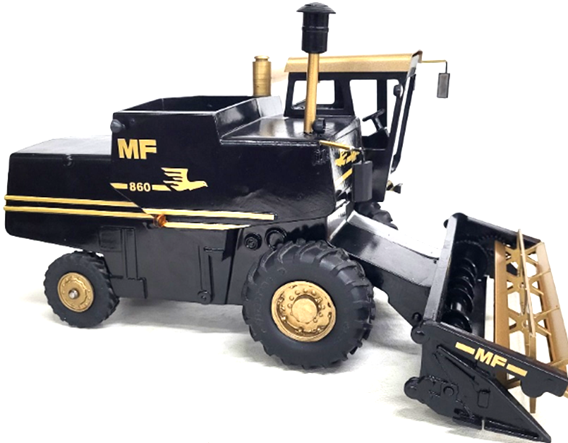 Custom Black & Gold “Phoenix” MF 860 Combine by Dan Kiley, Weber Gem-Acres New Idea 2row pull type Picker (s/n 16), Resin NI 314 Sheller, Original Allis 7040 & 7060 maroon-belly in Box, Orange Spectacular Super 100 combine, Employee Gold 185 in box, Allis 440